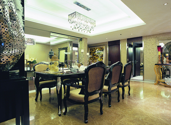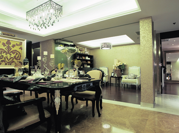 在設(shè)計上,墻面大面積的使用了古典歐式色彩的壁紙配合經(jīng)過提煉的歐式線條,使歐式不再是遙遠(yuǎn)的過去,而是鮮活時尚的品味象征。減掉了復(fù)雜的歐式護(hù)墻板使用了提煉過的石膏線勾勒出線框,把護(hù)墻板的形式簡化到極致。