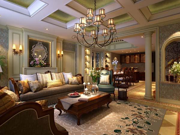 歐美風格裝修設計:開放式的客廳設計,客廳和餐廳完美地融合在一起,空間上并不會給人擁擠的感覺,反而顯得大氣十足。客廳的擺設搭配地板和各種家具,顯得溫暖舒心,墻面的裝飾和吊頂設計,讓客廳的裝飾顏色的造型合理搭配,高貴華麗的感覺不言而喻。