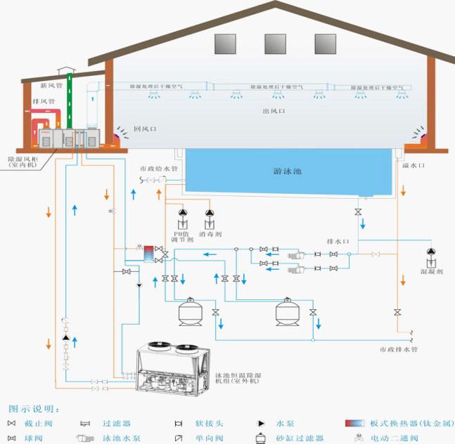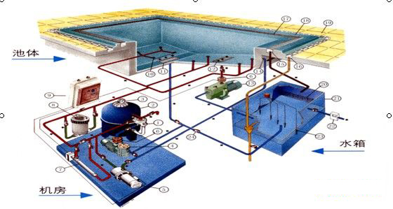 池水的過濾,是利用過濾精度高達6-15微米的過濾袋。通過吸水口將池水吸入,經過濾袋過濾后,向前面及側面的噴嘴排出泳池。這樣池水就產生了回旋原理,確保池中的水都經由過濾袋過濾。