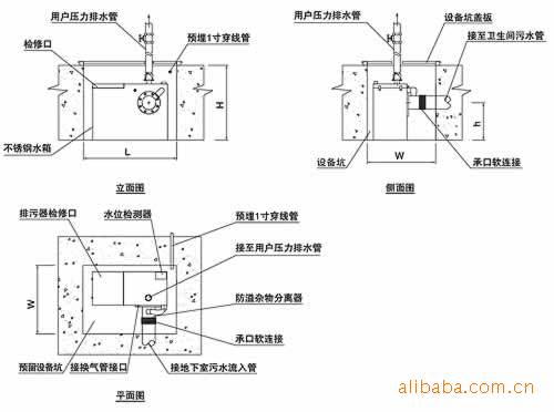 金利潔牌污水提升器則從根本上解決了環(huán)保的難題。該設(shè)備除了水泵、水箱、進(jìn)出水口等必備的材料以外,還配有一個(gè)雜物分離器,不要小看這個(gè)分離器,解決難題的重點(diǎn)就在這里。污水和雜物進(jìn)入水箱前,通過(guò)進(jìn)水口的止回閥,先進(jìn)入雜物分離器中,雜物被隔離在這里,污水通過(guò)過(guò)濾網(wǎng)、泵腔進(jìn)入水箱,當(dāng)水箱中的水位達(dá)到一定高度的時(shí)候,水泵啟動(dòng),水箱中的污水收到壓力先是被排到分離器中,由于水泵排水的壓力大于進(jìn)水壓力,所以進(jìn)水止回閥自動(dòng)關(guān)閉,同時(shí)出水止回閥自動(dòng)打開(kāi),污水和雜物被一同排出。利用這種反沖器的原理,可以避免雜物在污水提升器中于水泵接觸,也就不存在纏繞和沉積堵塞管道的現(xiàn)象,更不需要清掏,對(duì)室內(nèi)環(huán)境造成污染了。